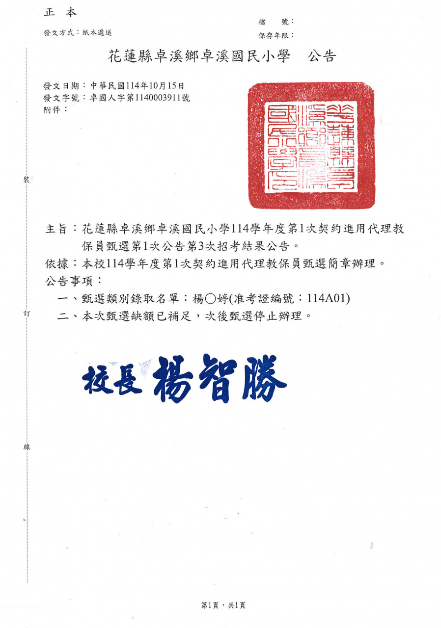 花蓮縣卓溪鄉卓溪國民小學114學年度第1次契約進用代理教保員(育嬰留停缺)甄選結果公告